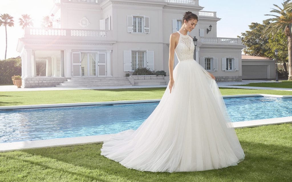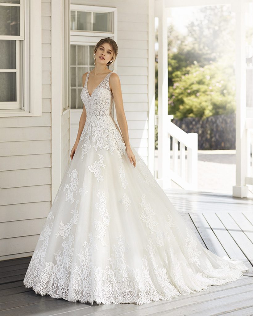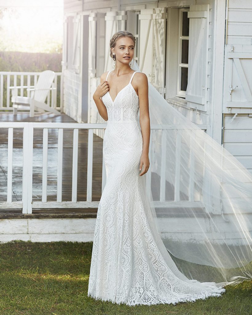 vestido de noiva traz um decote ombro a ombro incrível, seu corpo todo trabalhado em renda e a saia lânguida com um barrado largo em renda tornam esse modelo simplesmente maravilhoso.