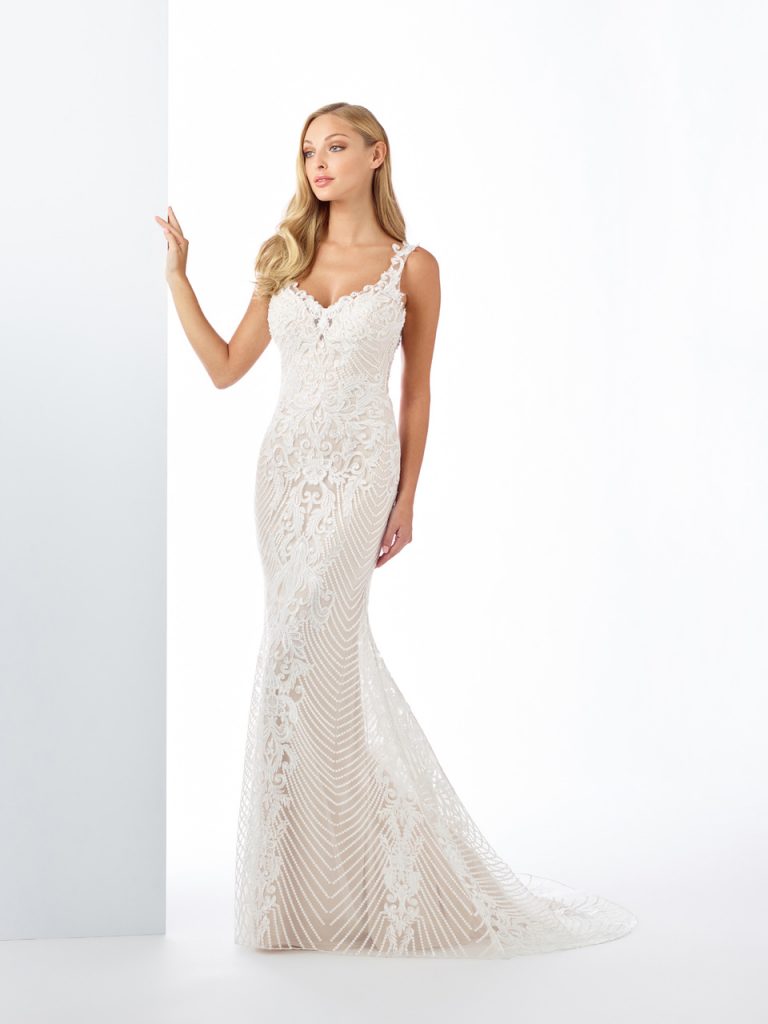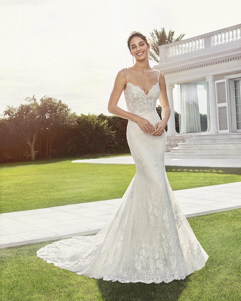Vestido de Noiva Rosa Clara Charlote cor off White Modelo Semi sereia com alças finas transçadas.