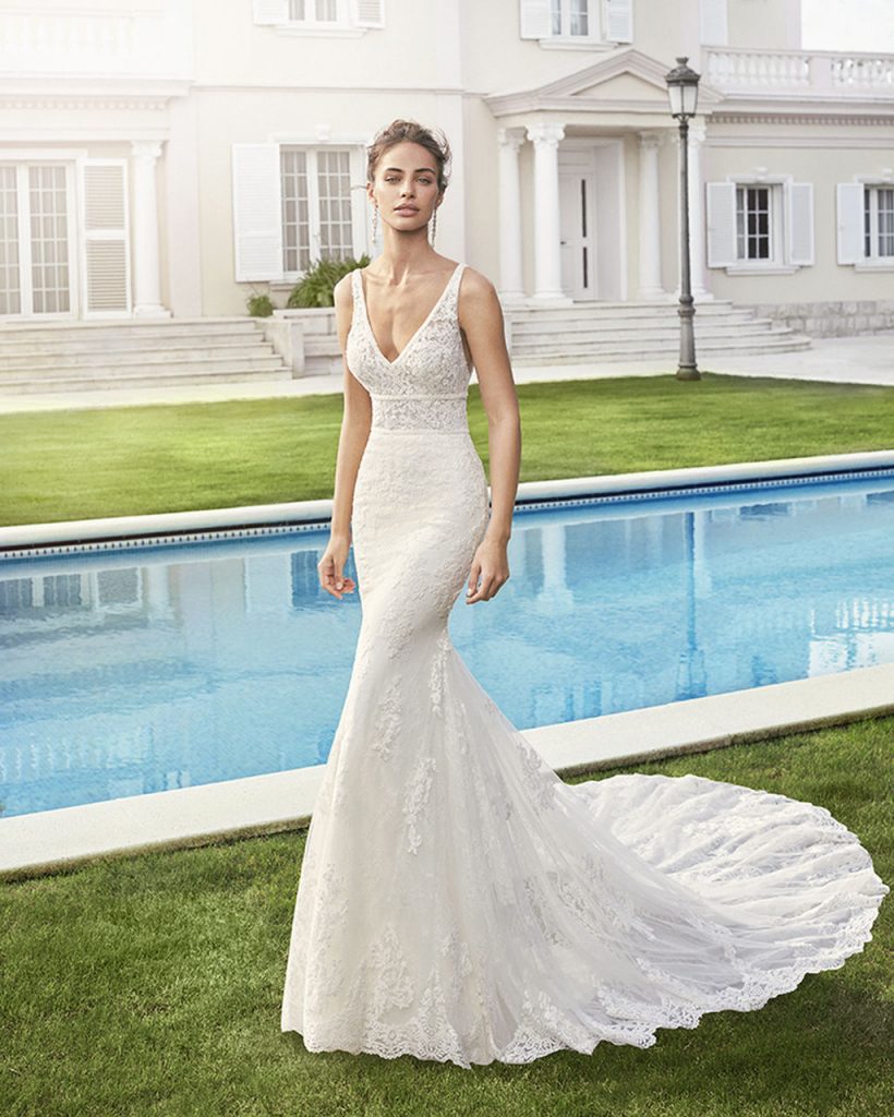 Vestido de Noiva elegante com decote V e costas com abertura ousada e transparência que valorizam as curvas femininas, seu corte mais seco e a renda francesa utilizada na confecção trazem ao modelo charme e sofisticação.