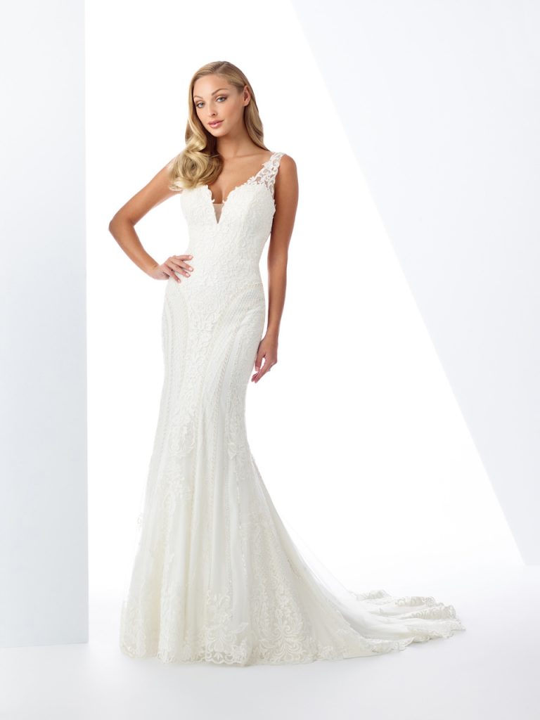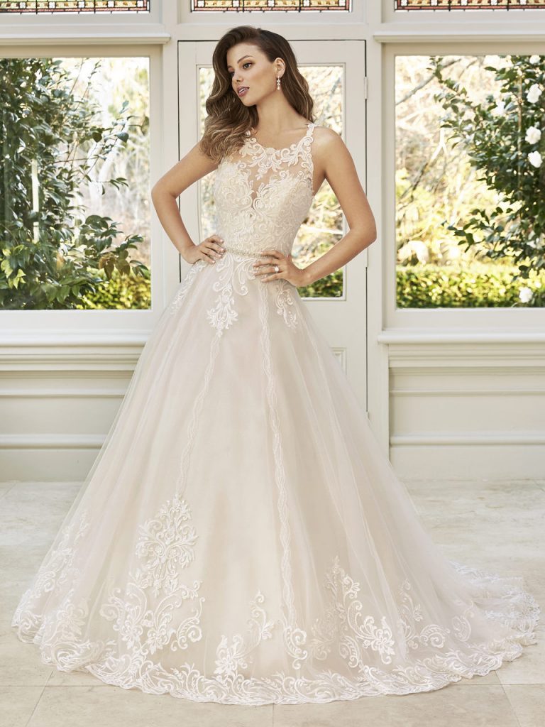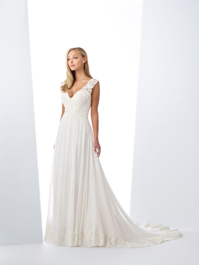MODELO LINHA A COM CALDA, ALÇAS FINAS E RENDAS DELICADAS SOBRE O TULE. COR OFF WHITE