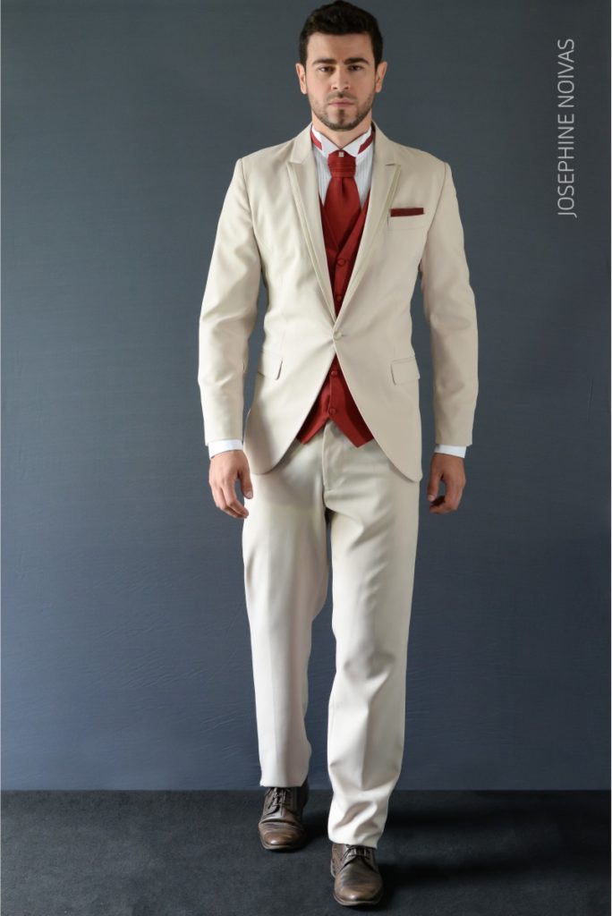 Traje de Noivo – Corte Slim cor beje com colete e gravata vermelha